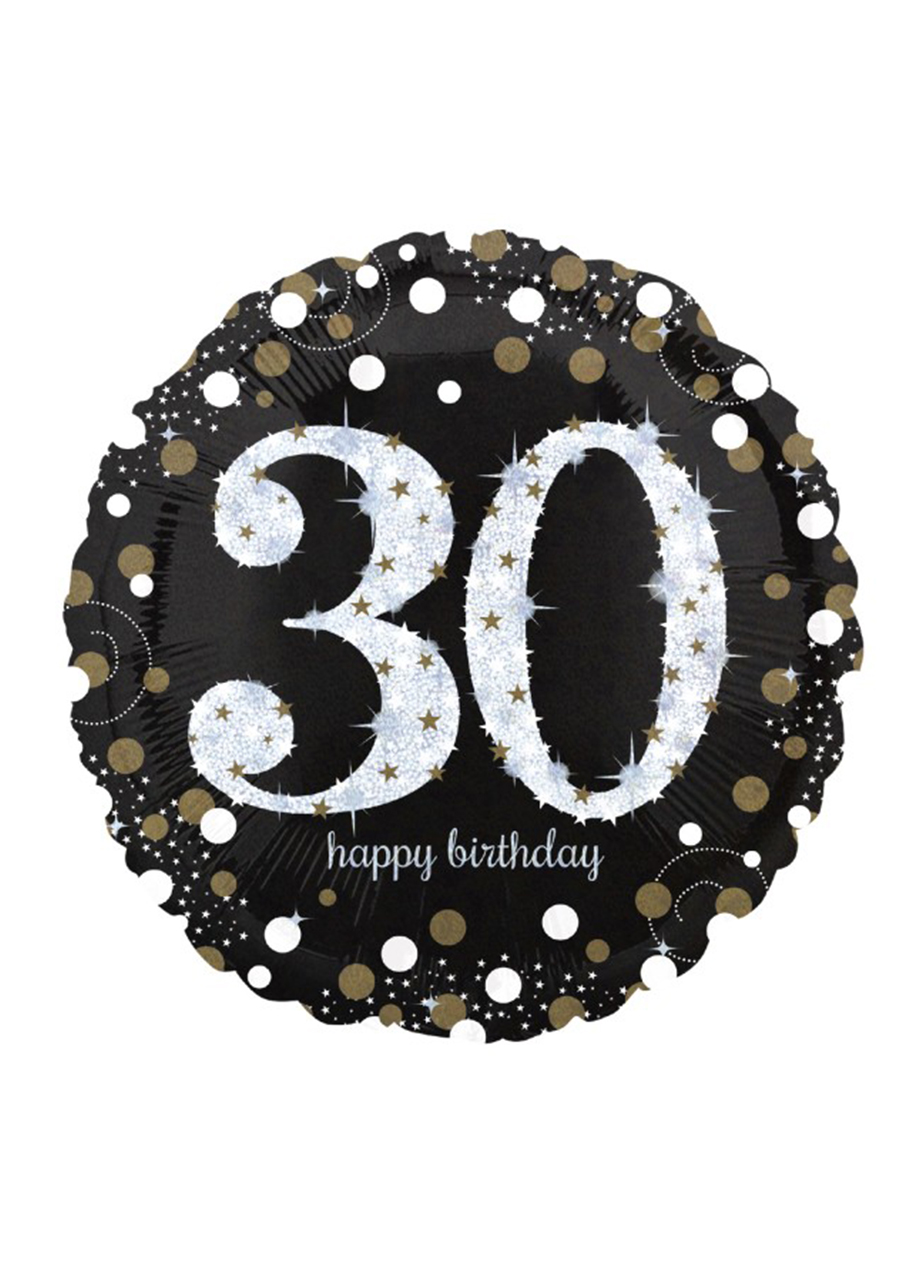 Balon foliowy 30 URODZINY Sparkling 43cm to efektowna dekoracja, która podkreśli wyjątkowy charakter trzydziestych urodzin. Okrągły balon w eleganckiej czarnej kolorystyce ozdobiony jest złotymi i srebrnymi akcentami oraz dużą cyfrą 30 z efektem połysku. Napis happy birthday i błyszczące detale nadają całości imprezowego klimatu. To idealny wybór na przyjęcie urodzinowe w stylu glamour lub elegancką domówkę.