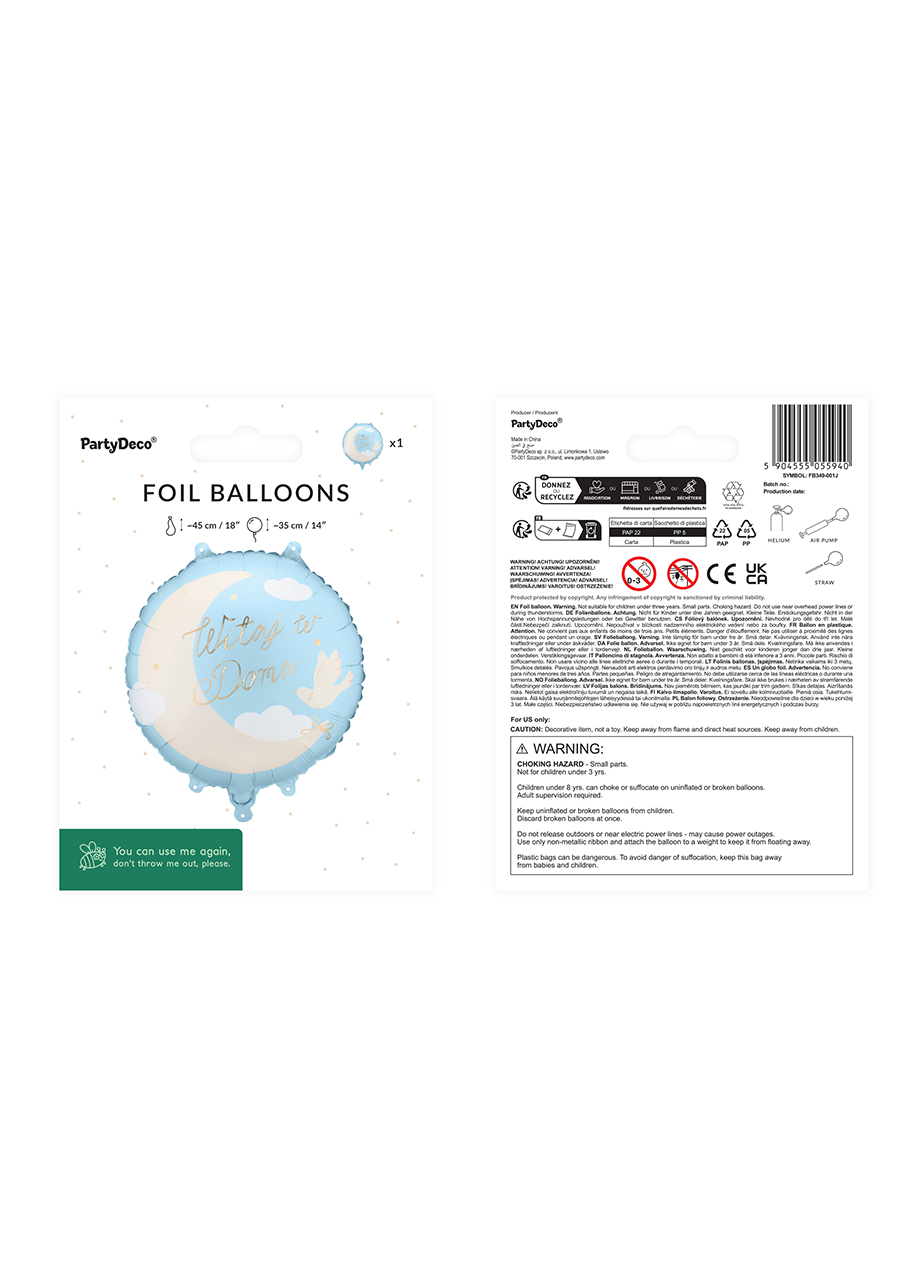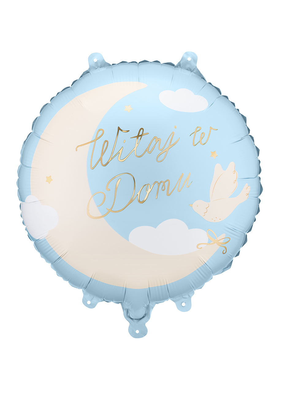 Balon WITAJ W DOMU niebieski to estetyczna i bardzo czytelna dekoracja, która pozwala w prosty sposób podkreślić moment powrotu do domu. Jasnoniebieska kolorystyka połączona z delikatnym motywem księżyca, chmur i skrzydeł buduje spokojną oraz ciepłą atmosferę. Taki balon doskonale sprawdzi się podczas powitania po narodzinach dziecka, powrotu mamy ze szpitala lub po dłuższej nieobecności bliskiej osoby. Dekoracja jest widoczna, ale nie przytłacza wnętrza. Pasuje zarówno do domu, jak i przestrzeni szpitalnej.