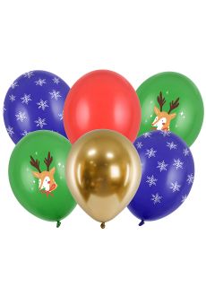 w komplecie: 6 sztuk (1 balon w kolorze złotym, 2 balony w kolorze niebieskim z białym nadrukiem; 1 balon w kolorze czerwonym; 2 balony w kolorze zielonym z nadrukiem)