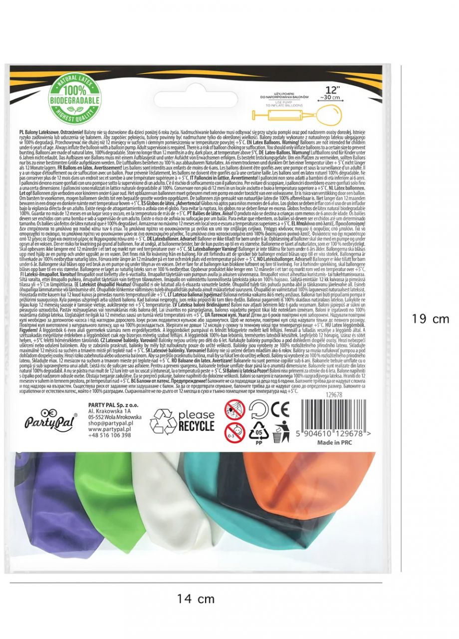 w komplecie: 6 sztuk balonów biodegradowalnych(1 balon w kolorze turkusowym z nadrukiem; 1 balon w kolorze białym z nadrukiem; 1 balon w kolorze czarnym z nadrukiem; 1 balon w kolorze fioletowym z nadrukiem; 1 balon w kolorze pomarańczowym z nadrukiem; 1 balon w kolorze zielonym z nadrukiem)