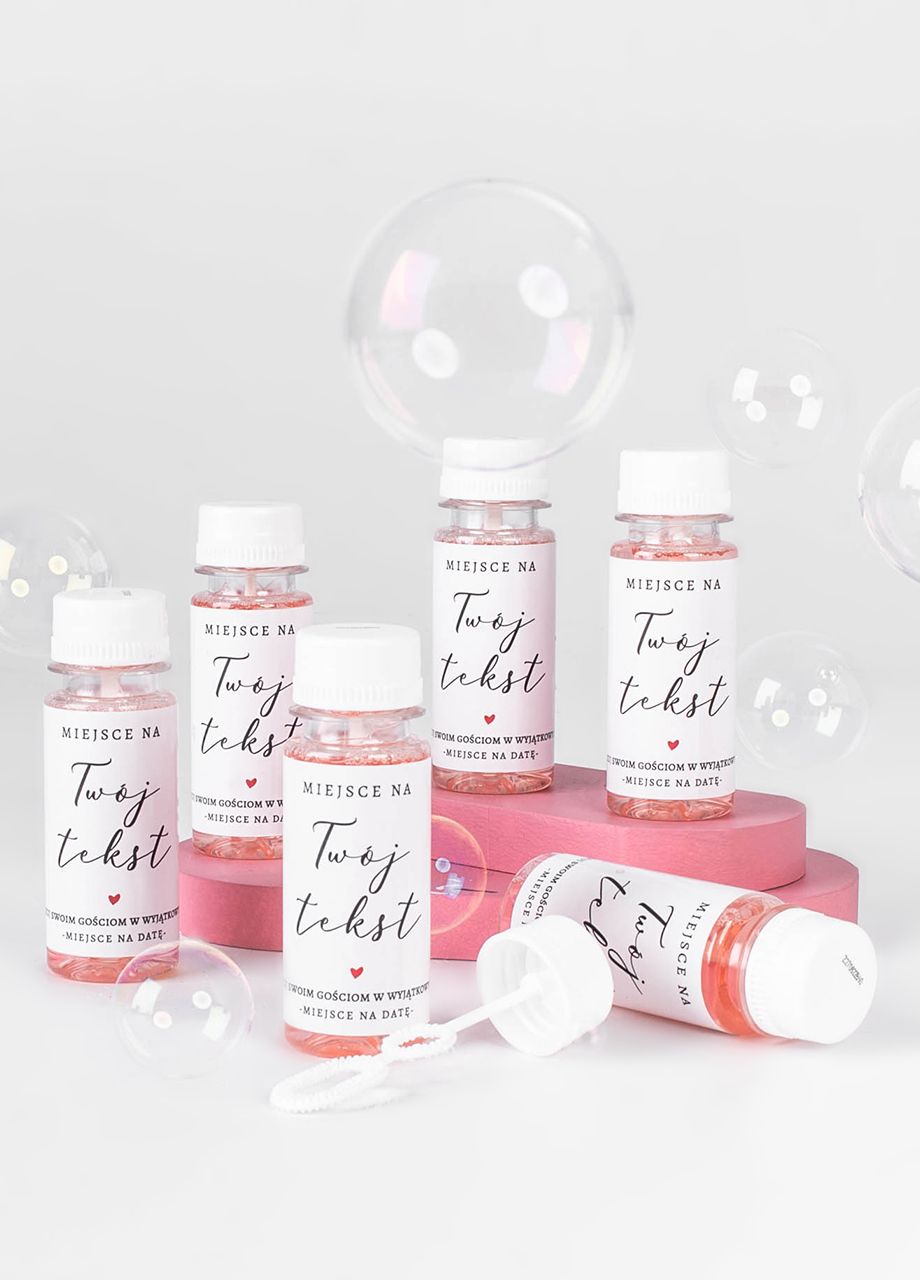 Bańki mydlane personalizowane to świetny pomysł na podziękowanie gościom za przybycie. W komplecie znajdziesz 6 buteleczek o pojemności 60ml - na każdej z nich umieszona zostanie etykieta z zaprojektowanym przez Ciebie napisem.
