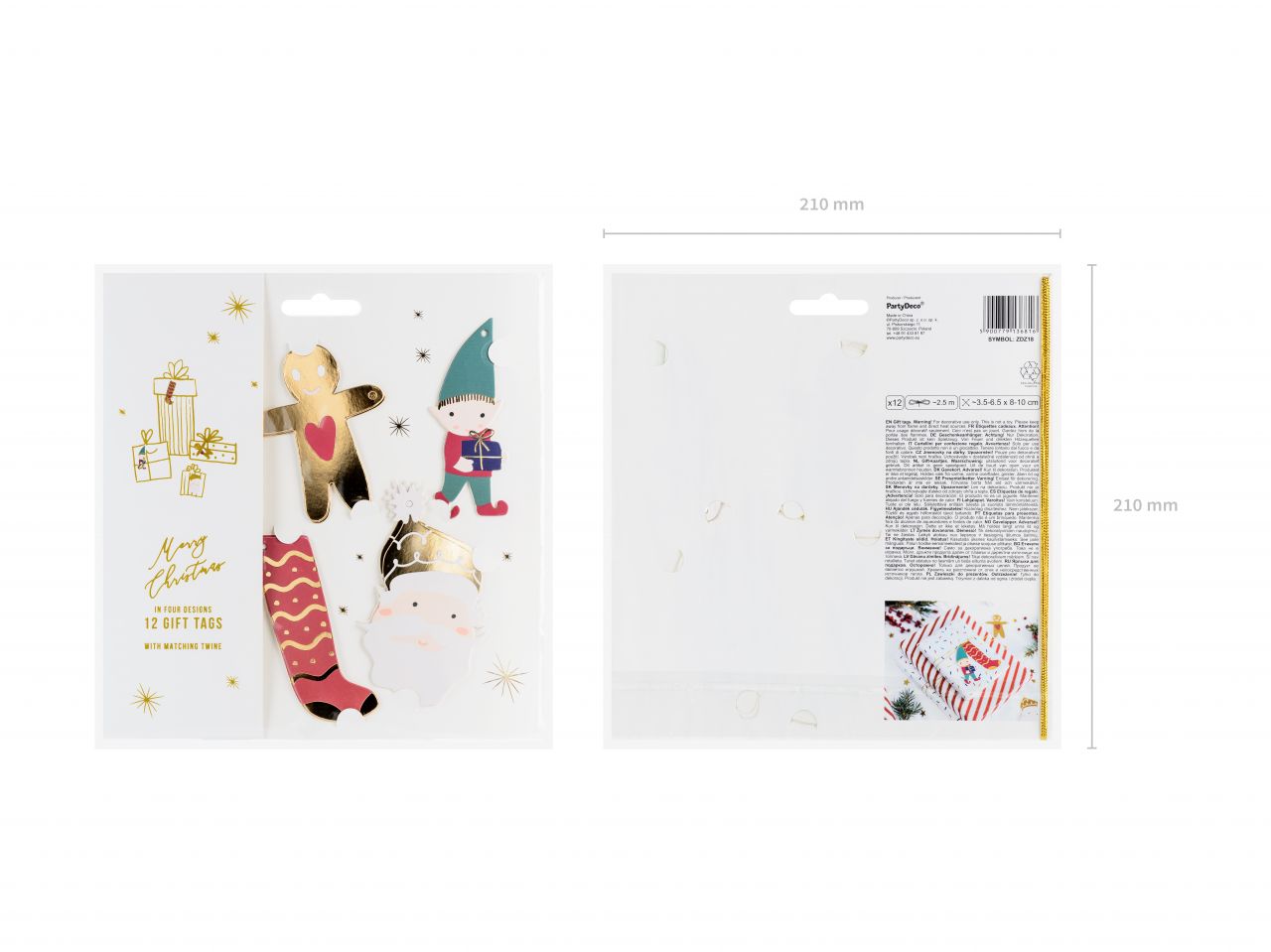 - zestaw 12 papierowych, jednostronnych zawieszek ze sznurkami- wymiary zawieszek: od ok. 6cm x 8,5cm do ok. 8cm x 10cm- długość sznurka: ok. 2,5m- dekoracje mocowane na złotym sznurku