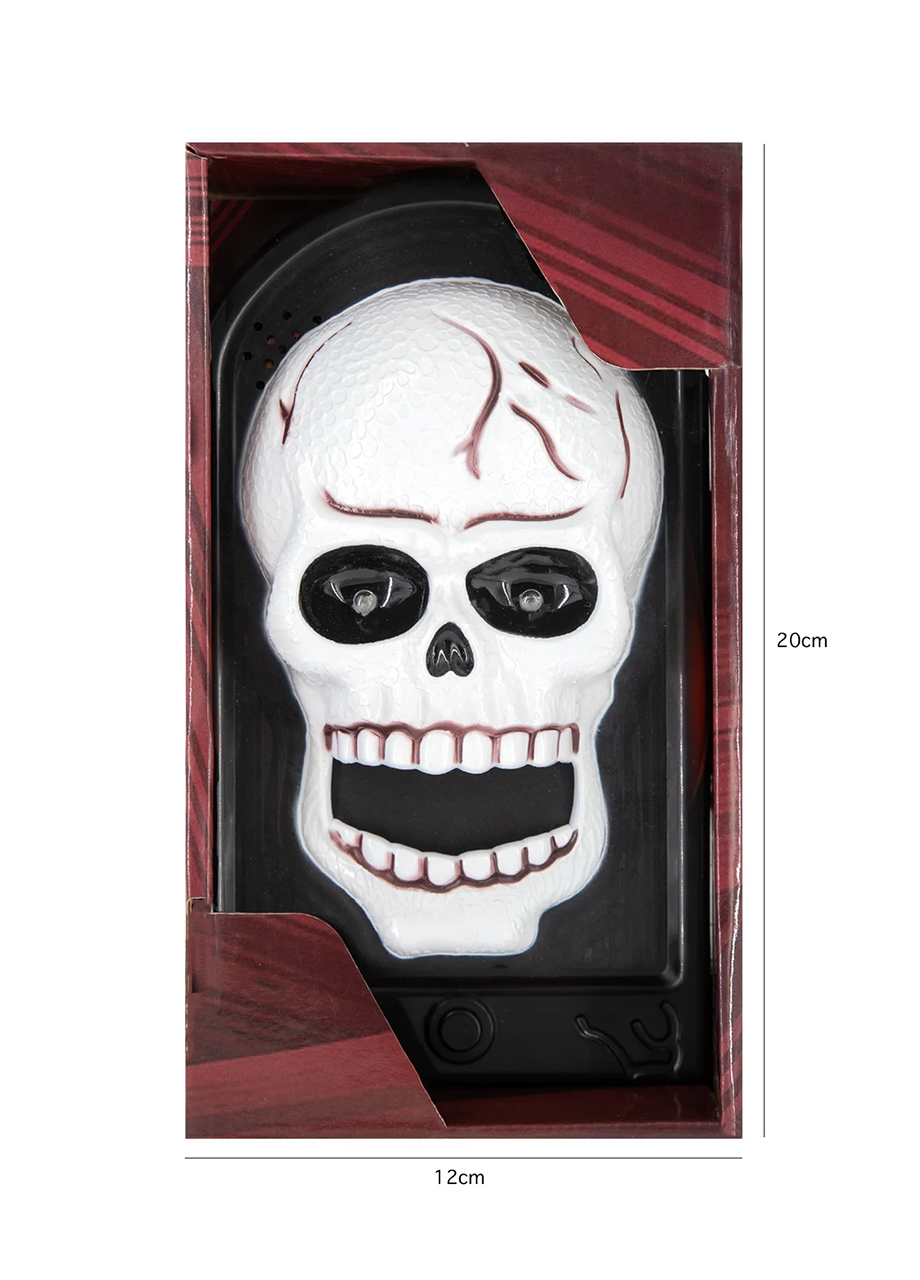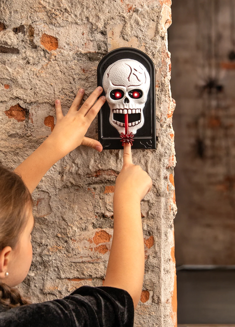 • dzwonek do drzwi w kształcie czaszki, wydaje dźwięki, śmiejąc się szyderczym głosem, oczy czaszki świecą