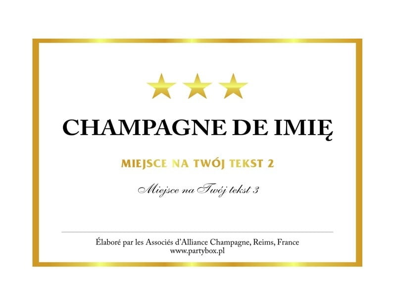Nasze autorskie etykiety na szampana są wystarczająco duże, by zakryć etykietę większości rodzajów szampana na polskim rynku, ale sprawdź wymiary, żeby się upewnić, czy będzie pasowała na szampana Twojego wyboru. Następnie wystarczy nakleić etykiety na oryginalną nalepkę i otrzymujesz personalizowaną butelkę szampana idealnego na każdą okazję wartą uczczenia.