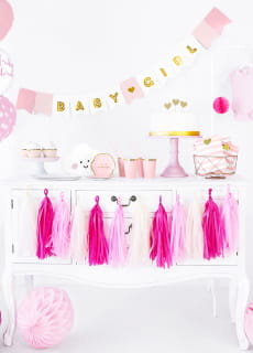 Girlanda flagi z napisem BABY GIRL. Dekoracja na baby shower w odcieniach bieli i różu ze złotym, metalizowanym napisem.
