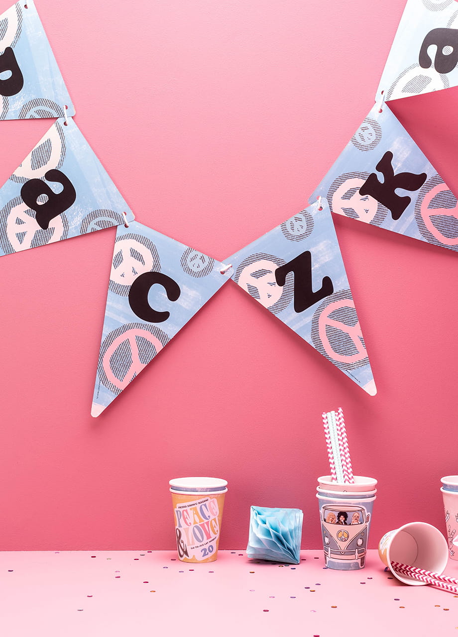 Girlanda personalizowana HIPPIE to dekoracja na urodziny, która zachwyci zarówno dzieci, jak i dorosłych. Kolorowe wzory oraz symbolika pokoju i miłości sprawiają, że jest to idealna dekoracja wisząca dla osób ceniących sobie oryginalność i kreatywność. Dekoracja urodzinowa, jaką jest girlanda personalizowana HIPPIE, doskonale sprawdzi się zarówno na przyjęciach w domu, jak i w plenerze.