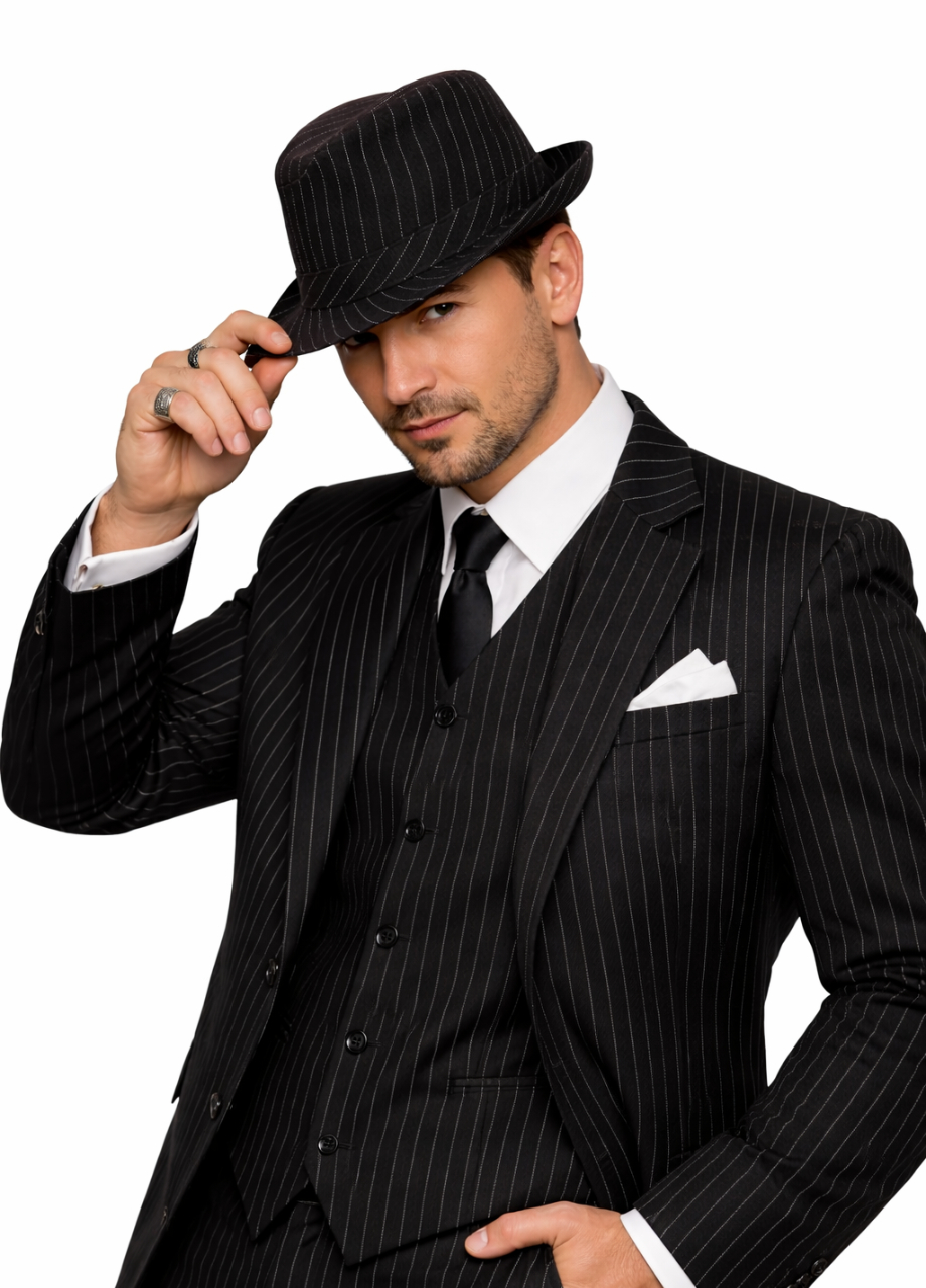 Stylowy kapelusz gangstera Lata 20 to prawdziwy hit dla każdego, kto chce dodać swojemu przebraniu nieco klasy i charakteru rodem z amerykańskich filmów o mafii. Ten czarny kapelusz z delikatnym prążkiem to połączenie elegancji i odrobiny buntu idealny wybór na imprezy tematyczne, bale przebierańców czy wieczory retro. Świetnie sprawdzi się jako efektowny dodatek do stroju dla mężczyzny, który lubi zwracać na siebie uwagę i podkreślać swój styl. Jeśli chcesz wyglądać jak prawdziwy dżentelmen z dawnych lat, to właśnie ten model jest dla Ciebie.