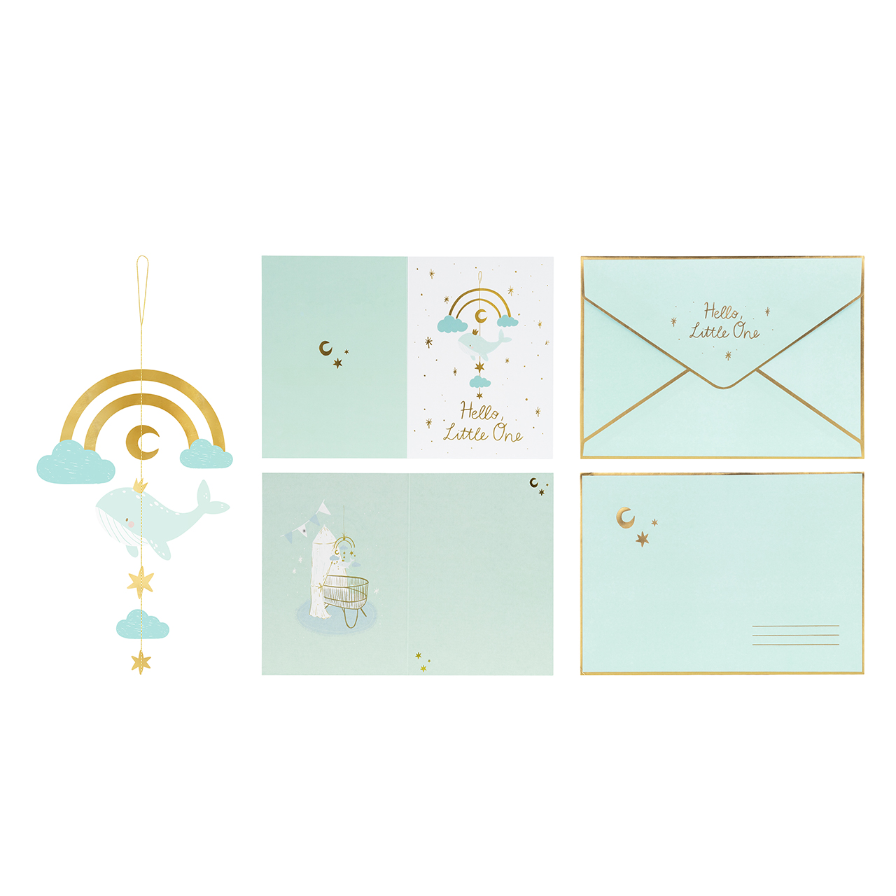 Kartka z okazji narodzin dziecka z zawieszką to idealny wybór na baby shower. Na białym tle kartki widnieje uroczy wizerunek wieloryba, który dodaje jej uroku i sprawia, że od razu wprowadza w radosny nastrój. Pod wielorybem znajduje się napis "Hello, Little One" - miłe słowa powitalne dla nowonarodzonego dziecka.