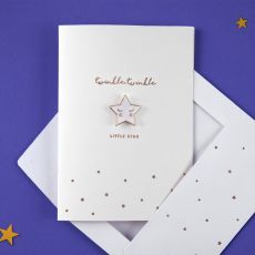 Biała kartka z okazji narodzin dziecka w zestawie z uroczym pinem w kształcie gwiazdki. Wewnątrz wypisz życzenia płynące prosto z serca i wspaniały upominek gotowy! Taka śliczna kartka z okazji narodzin dziecka to doskonały dodatek do prezentu lub upominek na narodziny malucha.