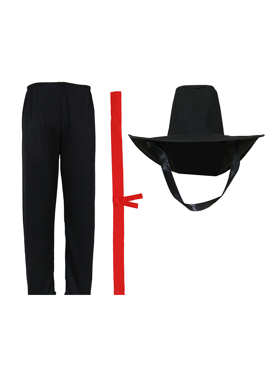 bluzka, spodnie, pasek, peleryna, kapelusz