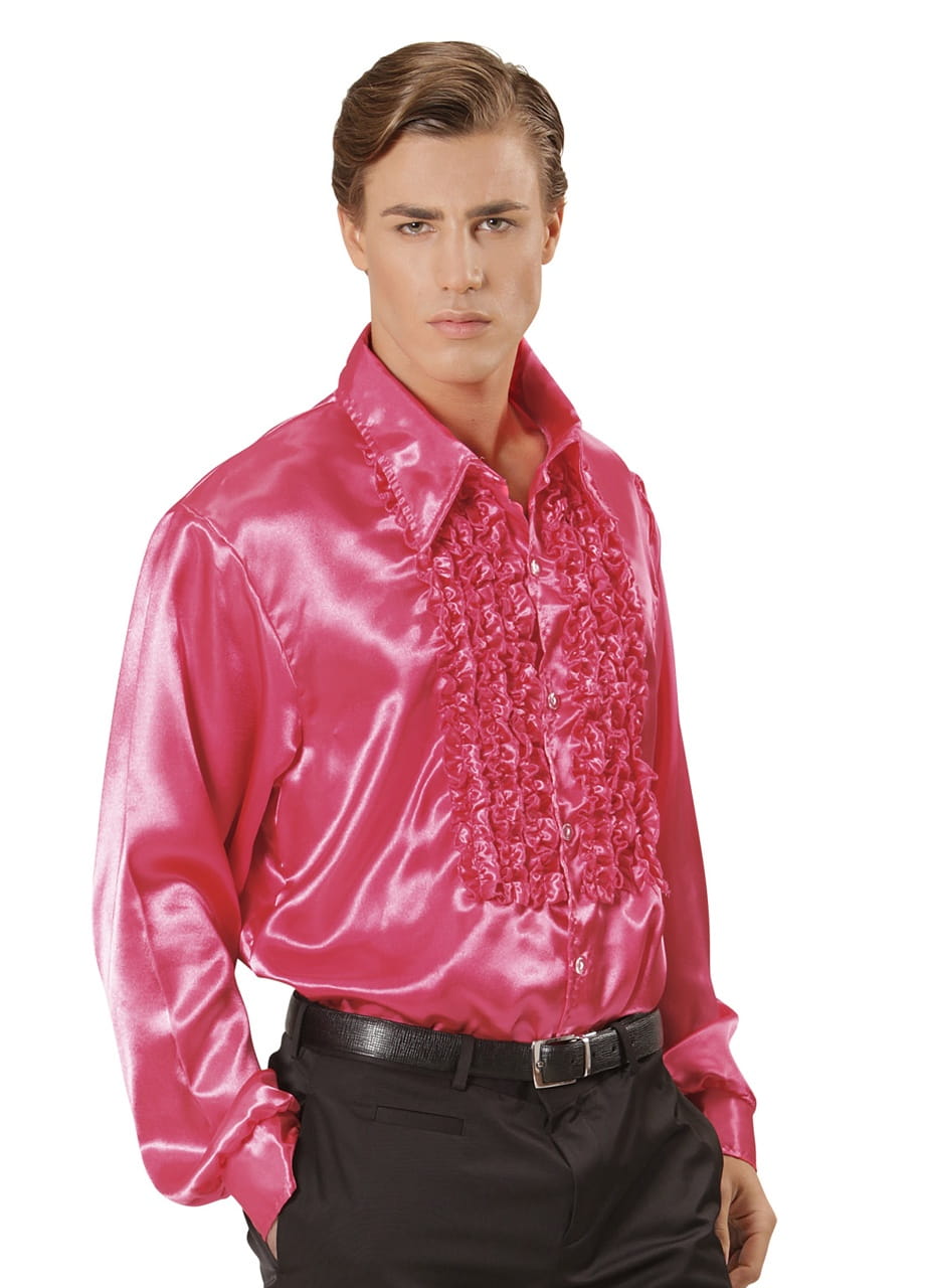 Koszula satynowa z żabotem w kolorze różowym, w której zabłyśniesz na każdej imprezie. Daj się zauważyć i zostań królem Disco.