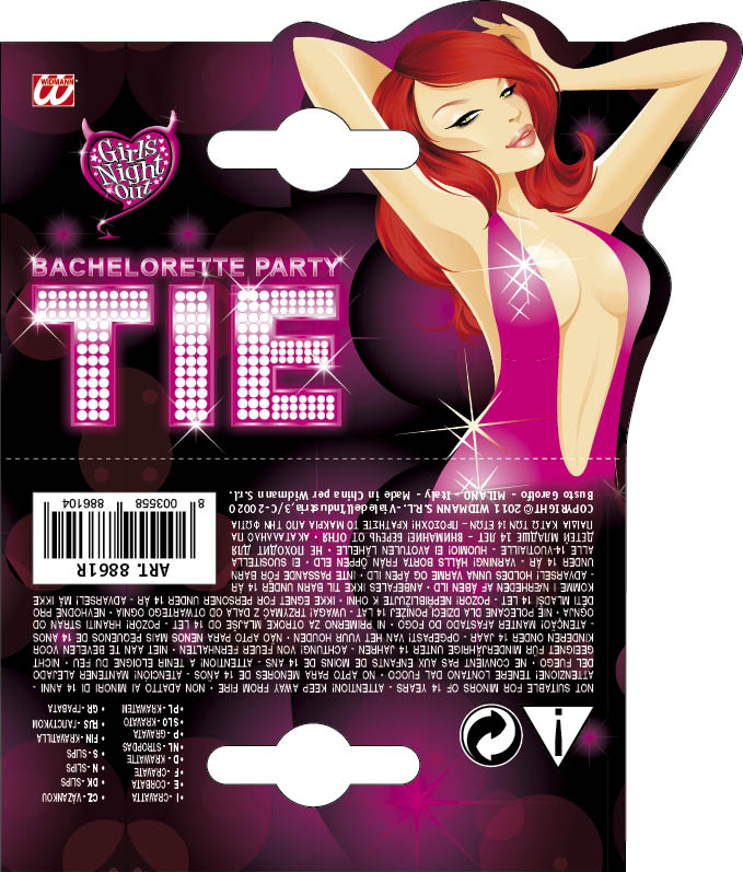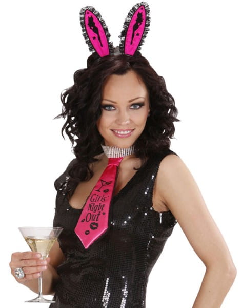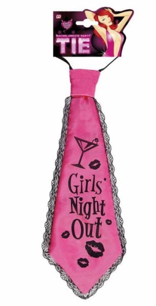 materiałowy, różowy krawat z napisem Girls Night Out, obszyty czarną koronką, mocowany na gumce