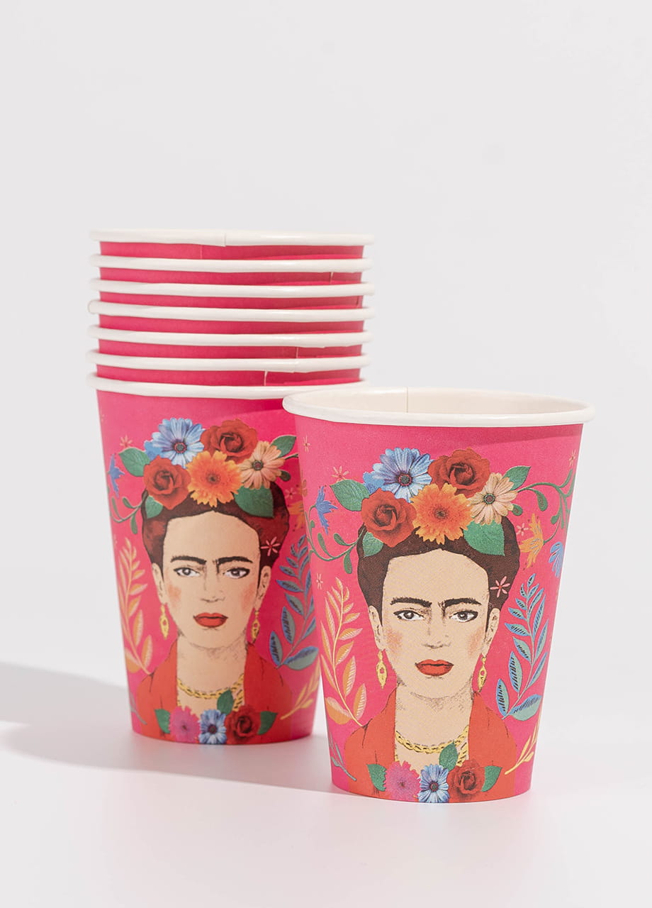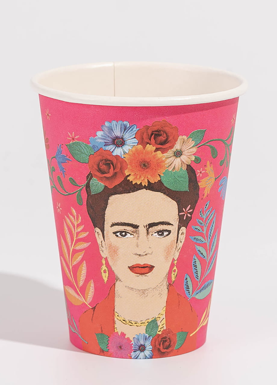 Papierowe kubeczki z wizerunkiem Fridy Kahlo. Motyw idealny zarówno na wieczór panieński jak i garden party.