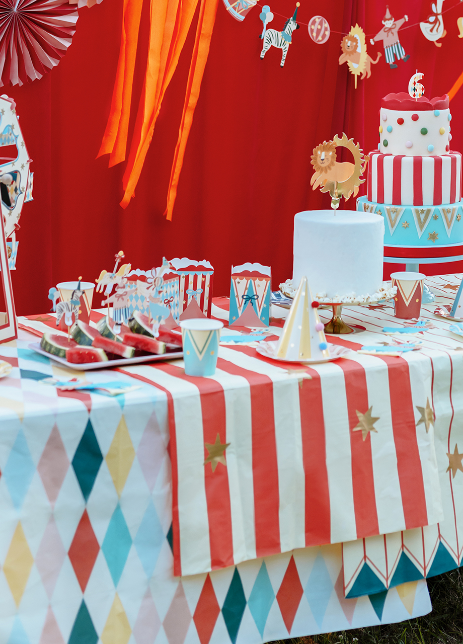 Chcesz stworzyć magiczną atmosferę na przyjęciu? Obrus jednorazowy na urodziny dziecka CYRK to doskonały wybór! Jego kolorowy wzór inspirowany namiotem cyrkowym doda stołowi wyjątkowego charakteru i sprawi, że każde dziecko poczuje się jak na prawdziwym przedstawieniu. To świetna dekoracja, która podkreśli temat imprezy i zachwyci małych gości.
