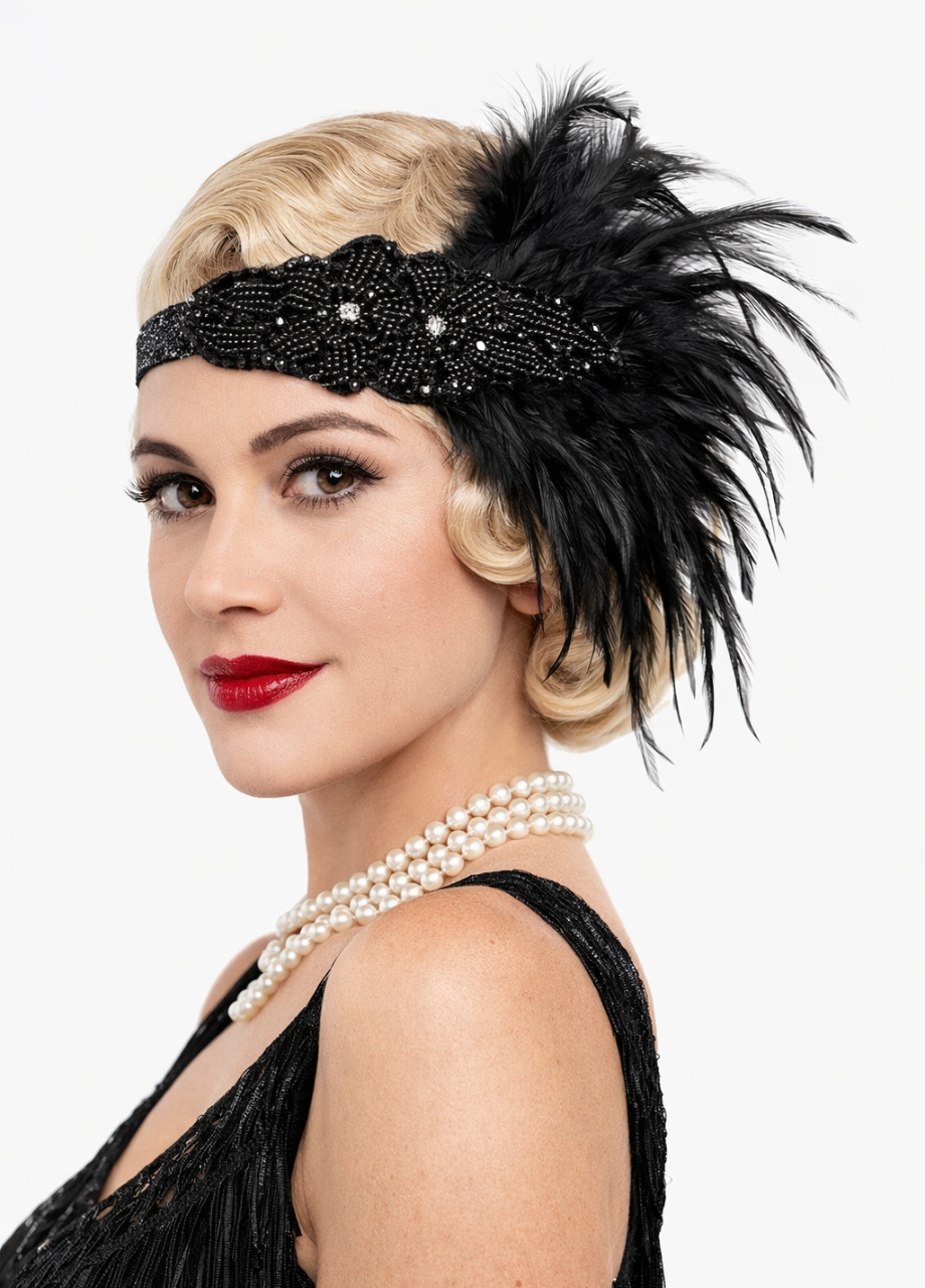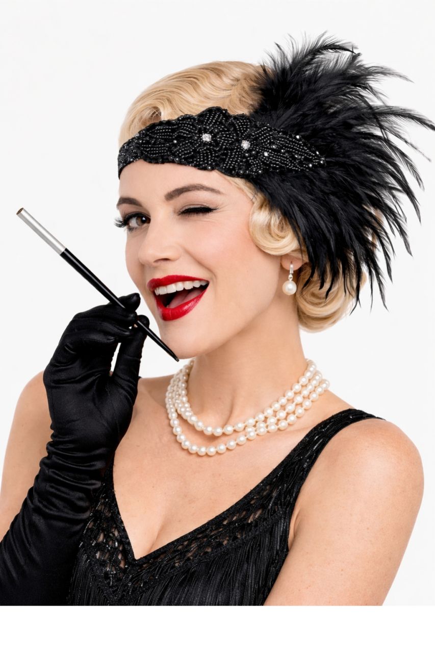 Mała czarna, smokey eye i finezyjna opaska z piórami. To kobiety z klasą, które pewne siebie, dbały o poważanie i szacunek w towarzystwie mężczyzn. Stwórz niebanalne zestawienie wzorów i fasonów. Połącz oryginalną kreację z błyszczącego materiału z wyrazistymi ozdobami w postaci piórek, cekinów, pereł i frędzli. Karnawał, retro party, sylwester z motywem przewodnim w stylu lat 20. i nie tylko. Czarna opaska z piórkiem lata 20 może być wykorzystana wielokrotnie na różnych zabawach.