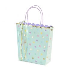 - papierowa torebka na prezent w kolorze miętowym z kolorowym i złotym metalizowanym nadrukiem, kolorowymi tasiemkami i nadrukiem w kolorze fioletowym w środku torebki,
