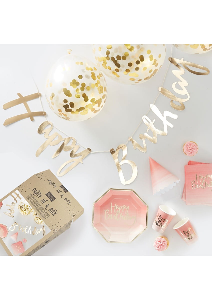Party box urodzinowy HAPPY BIRTHDAY ombre, czyli pudełko pełne wspaniałych dekoracji, potrafi zachwycić każdego! Zestaw dekoracji urodzinowych zawiera miedzy innymi girlandy urodzinowe, balony z konfetti, czapeczki urodzinowe dla gości i wiele innych gadżetów. Wszystko jest utrzymane w jednej gamie kolorystycznej, dzięki czemu zarówno dekoracje sali, jak i elementy nakrycia stołu doskonale się ze sobą komponują. Box urodzinowy HAPPY BIRTHDAY to zestaw dekoracji urodzinowych, który umożliwia przygotowanie miejsca imprezy w kilka chwil. Jednym kliknięciem można zamówić party box, który ma w sobie wszystko, co jest niezbędne dla zorganizowania imprezy nawet dla kilkunastu osób! Bez trudu można też dobrać inne dekoracje z oferty sklepu, jeśli chcemy jeszcze strojnej udekorować salę i stół. Box urodzinowy HAPPY BIRTHDAY to piękny i dość uniwersalny zestaw dekoracji urodzinowych, który sprawdzi się zarówno na przyjęciu urodzinowym dla dorosłych jak i dla dziecka!