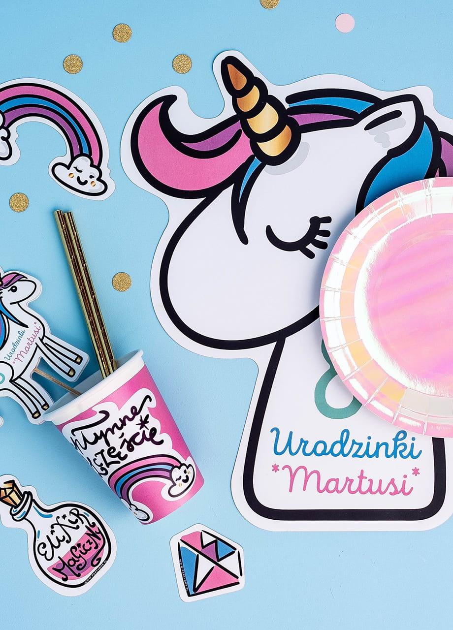 Zestaw czterech tekturowych dekoracji w kształcie głowy jednorożca. Te jednostronnie zadrukowane ozdoby będą idealne jako podkładki na stół lub ozdoba ściany. Dzięki możliwości personalizacji bajkowe jednorożce stają się jeszcze bardziej wyjątkowe i wywołają uśmiech na twarzy każdej małej miłośniczki bajek.