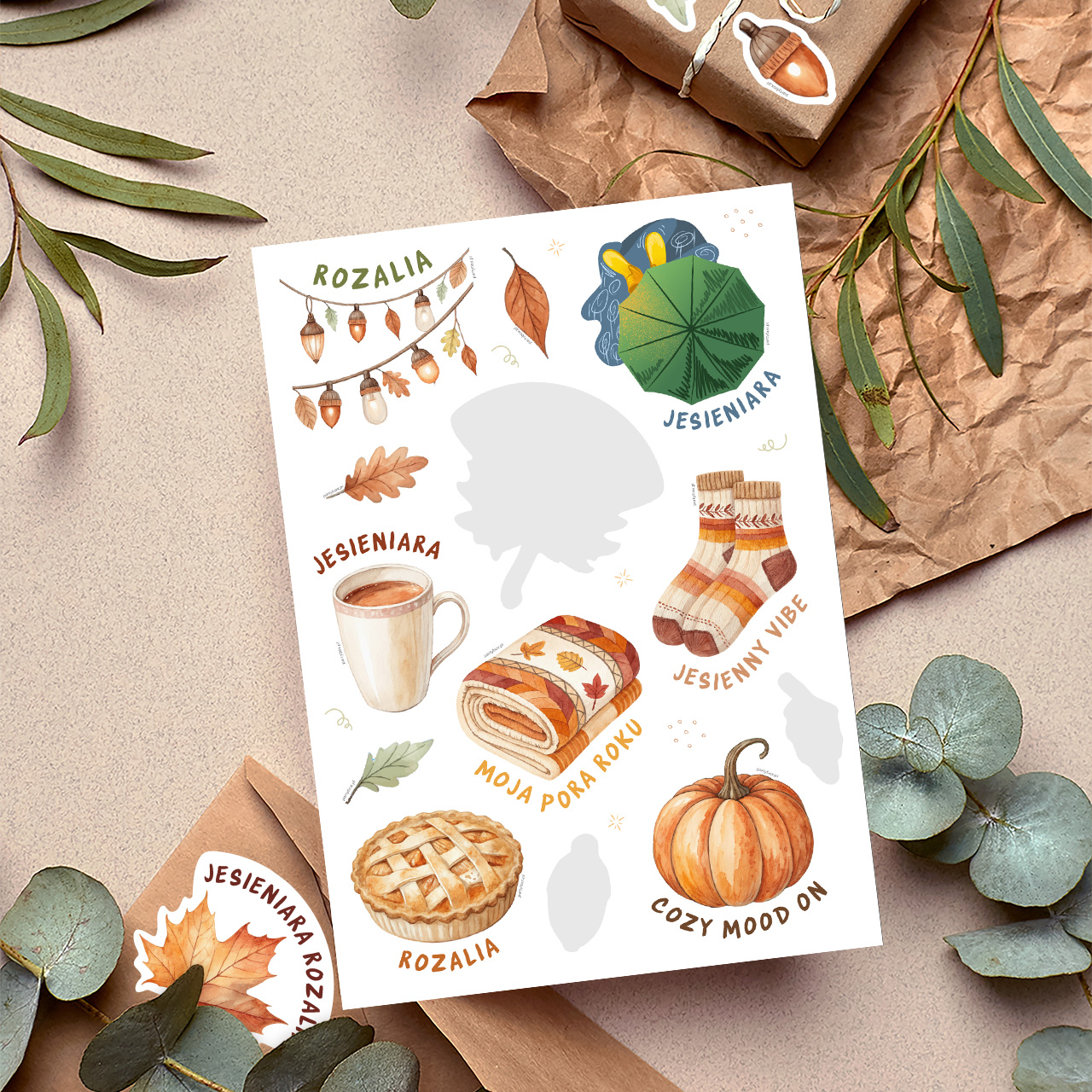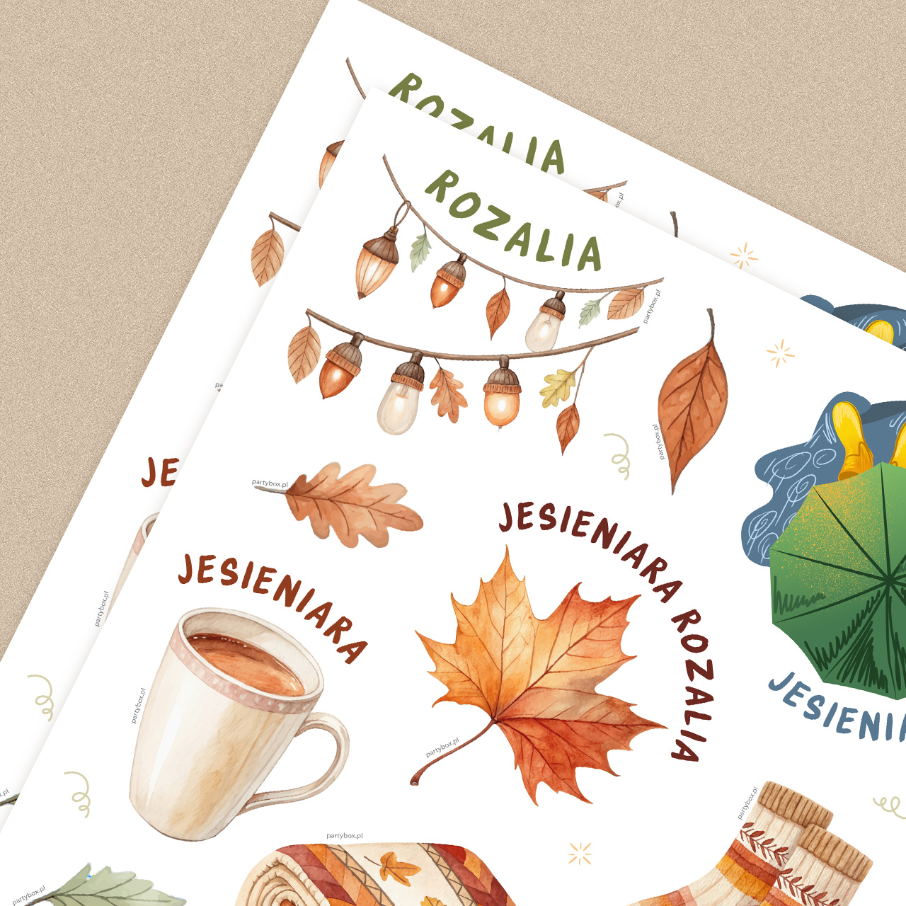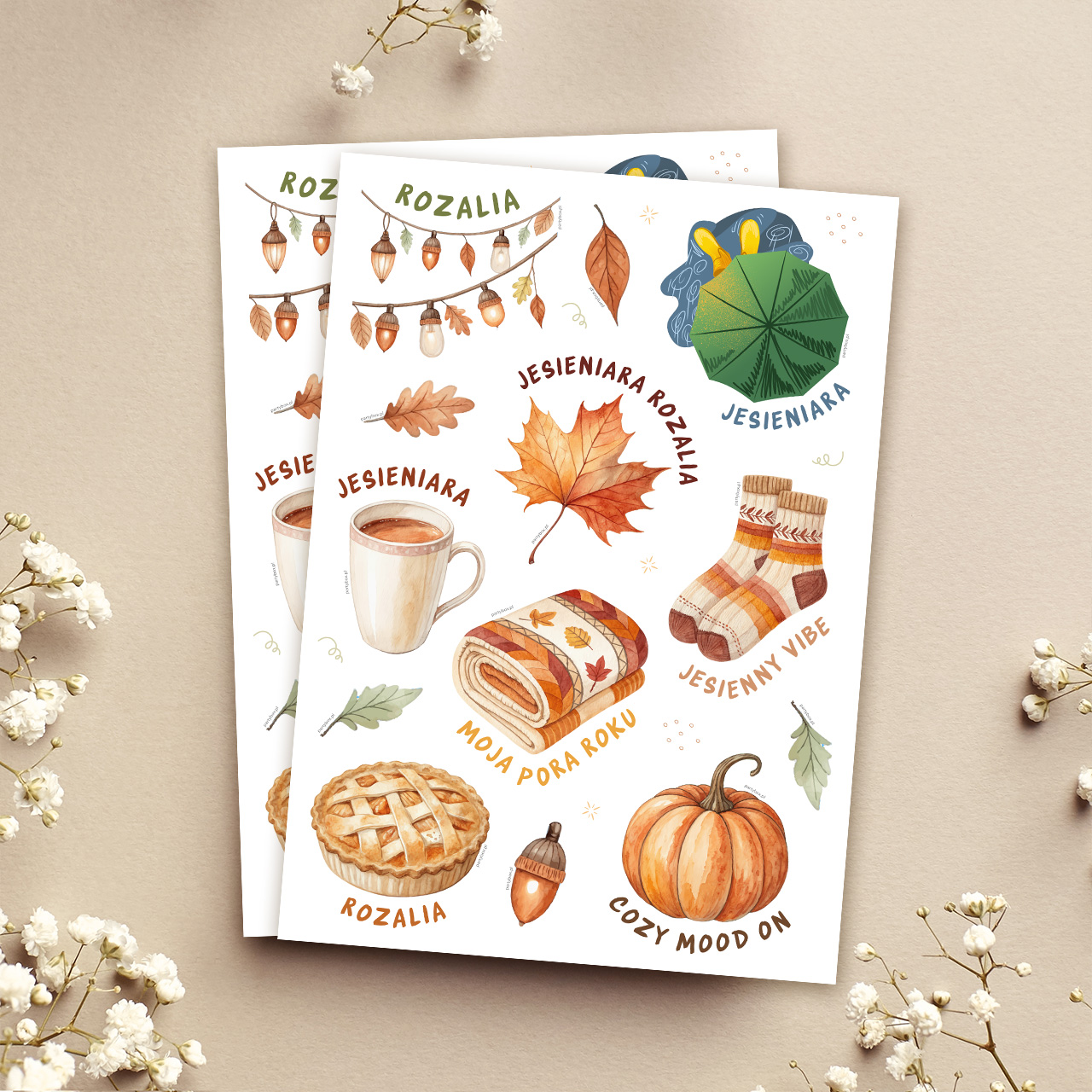 Jeśli kochasz zapach cynamonu, ciepłe swetry i szelest liści pod stopami, te personalizowane naklejki JESIEŃ są stworzone właśnie dla Ciebie! To zestaw pełen jesiennych kolorów i pozytywnej energii, idealny, by ozdobić planer, laptopa, kubek czy list do przyjaciółki. Te naklejki wprowadzą Cię w przytulny, jesienny klimat.