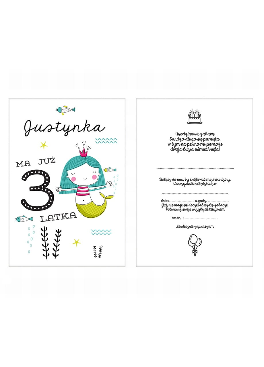 Na okładce znajduje się królewna syrenka i jej podwodny świat. Kolorowa grafika podoba się dzieciom, a postać syrenki od razu przykuwa uwagę. Na takim zaproszeniu chce podpisać się każda mała solenizantka, dlatego okładkę można spersonalizować. Zaproszenie na 3 urodziny wypełnia się szybko, wystarczy podać informacje na temat imprezy w wykropkowanych miejscach. Tak wesołe zaproszenie warto wręczyć osobiście każdemu koledze i koleżance z przedszkola lub placu zabaw.