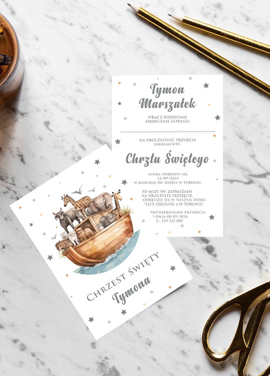 Wprowadzając imię dziecka oraz datę ceremonii personalizowane zaproszenia na chrzest ARKA NOEGO staną się pamiątkowym elementem tego wyjątkowego dnia. Każde zaproszenie jest starannie zaprojektowane, by wprowadzić gości w magiczną atmosferę tego sakralnego wydarzenia. Zapraszamy do skorzystania z naszych usług, aby stworzyć zaproszenia na chrzciny, które będą doskonałym wstępem do tego istotnego wydarzenia religijnego.