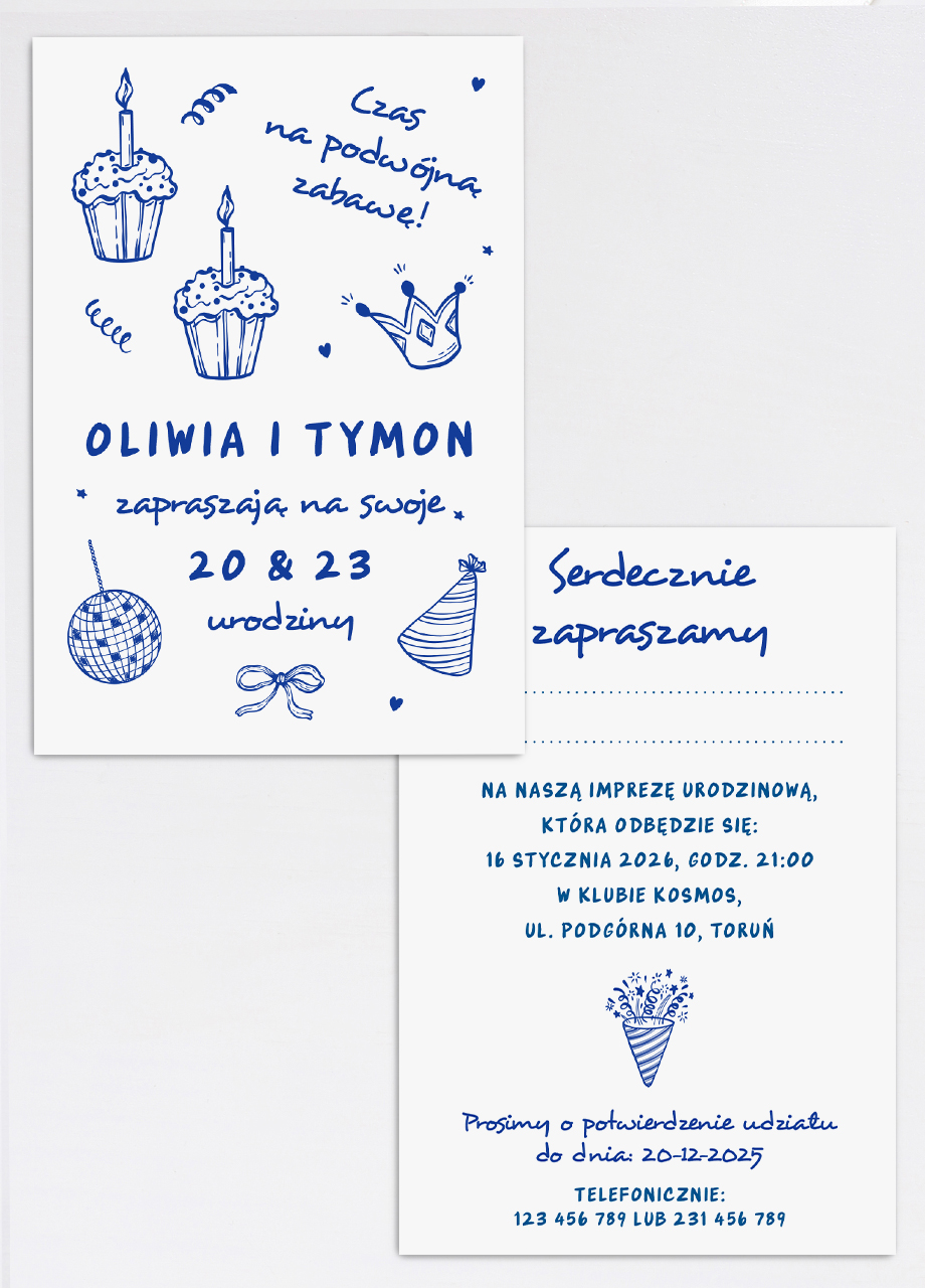 dwustronnie zadrukowane, personalizowane zaproszenia w formie kartki pocztowej