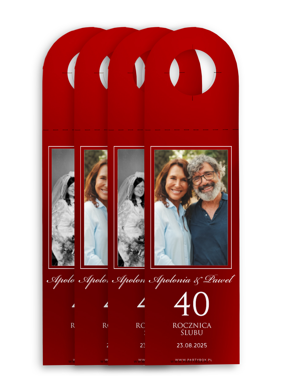 Jeśli szukasz oryginalnego sposobu na udekorowanie trunków, te personalizowane zawieszki na alkohol RUBINOWE GODY będą doskonałym wyborem. Możesz je połączyć z innymi ozdobami, aby stworzyć spójną kompozycję. Wybierz te zawieszki, aby nadać przyjęciu niepowtarzalnego stylu i sprawić, że Rubinowe Gody będą jeszcze bardziej wyjątkowe!