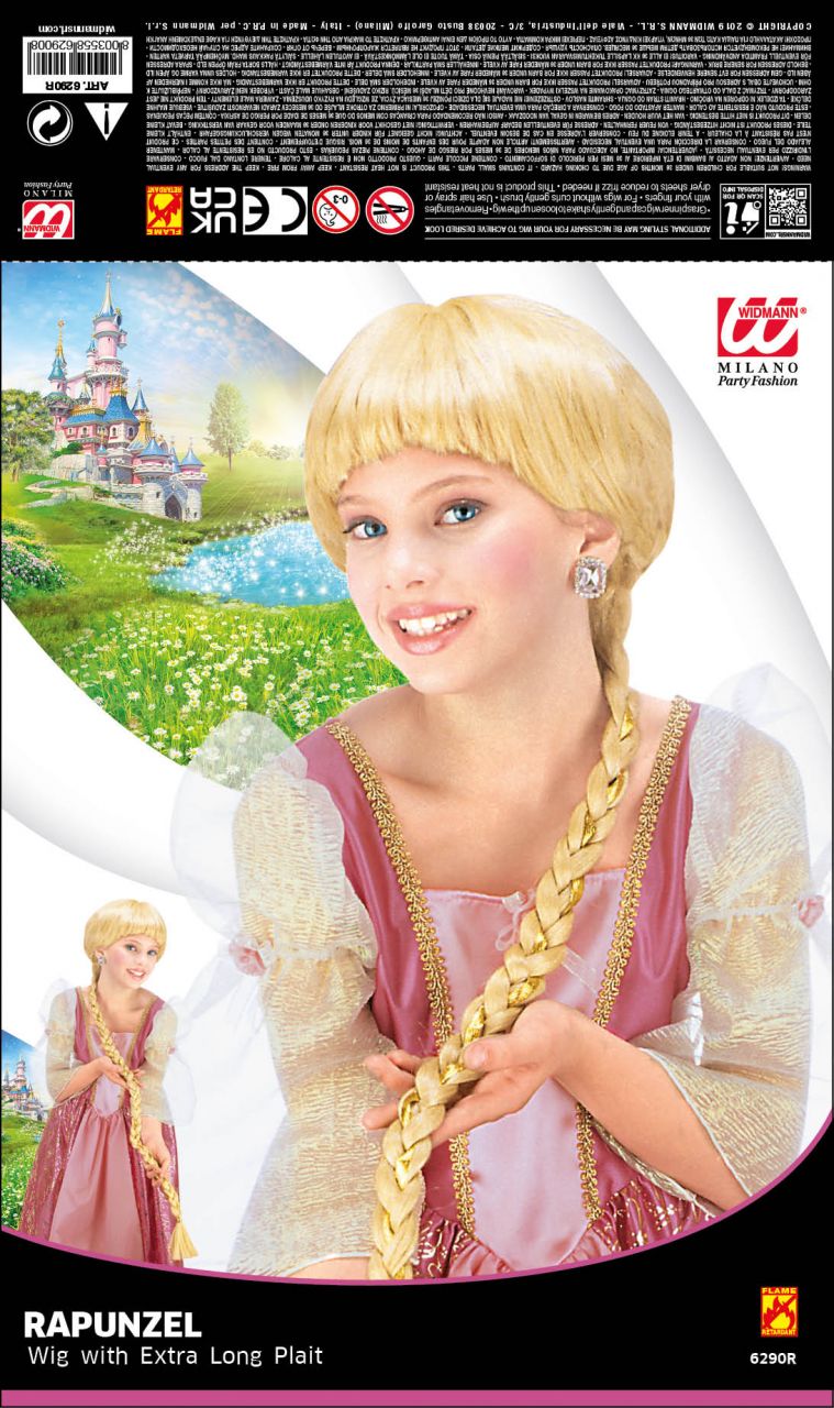 Wymodelowana blond peruka ze sztucznych włosów imitująca fryzurę głównej bohaterki bajki Roszpunka. Długi blond warkocz ok. 109 cm z gęstą prosta grzywką.