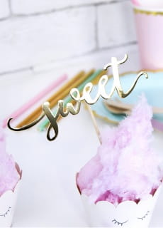 Drewniane pikery z papierowymi napisami LOVE, SWEET i YUM w kolorze złotym. Wspaniałe rozwiązanie jeżeli chcesz szybko i oryginalnie udekorować babeczki lub przekąski na ślubie, chrzcinach czy baby shower.