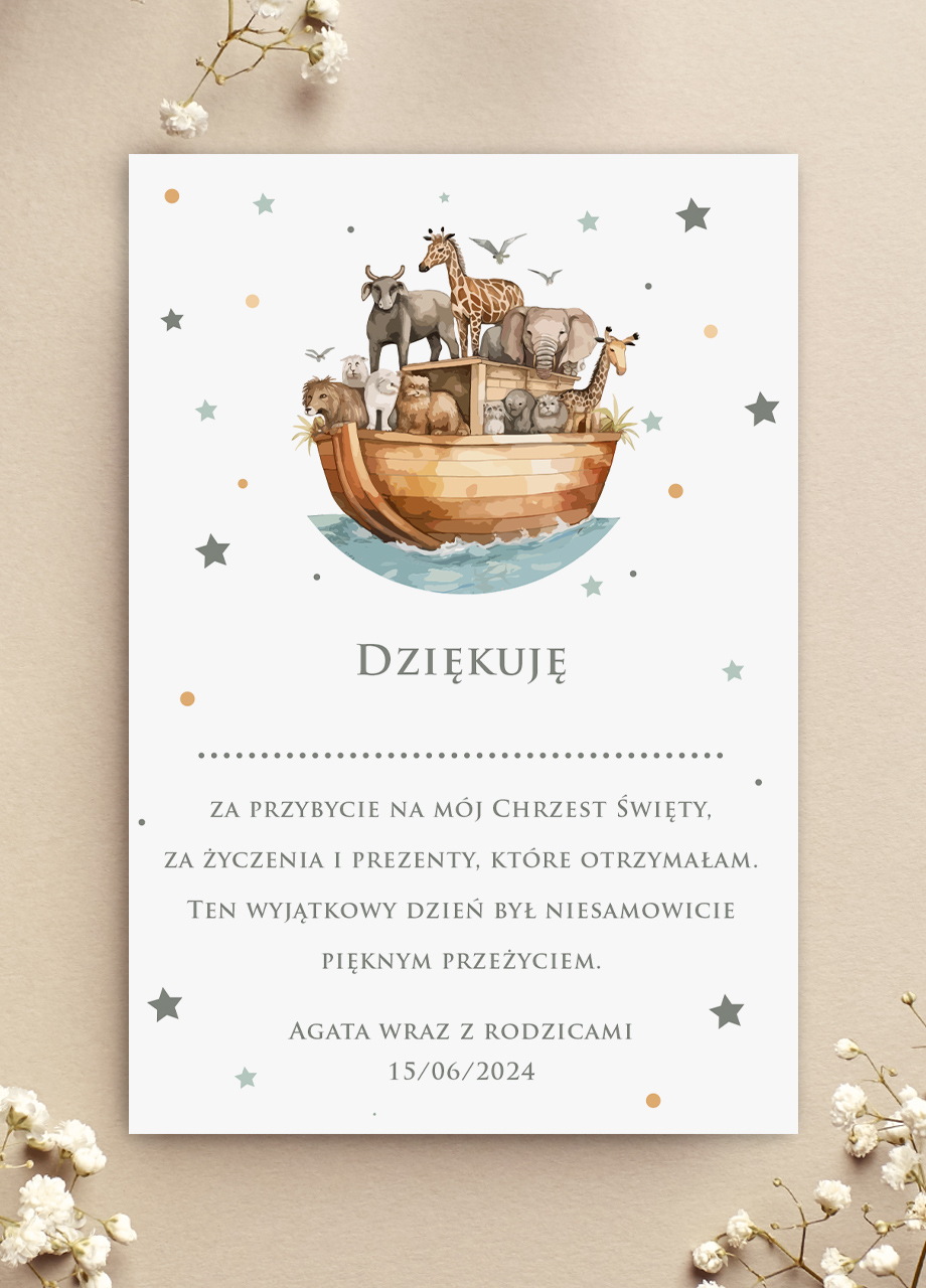 Arka Noego symbolizuje nie tylko wiarę i nowe początki, ale także solidarność i wsparcie, które są tak ważne w życiu. Otrzymując te podziękowania za przybycie na chrzest ARKA NOEGO, goście poczują się docenieni i mile widziani, co tworzy ciepłą atmosferę pełną miłości i współczucia. To gest, który trwa dłużej niż samo wydarzenie, pozostawiając trwałe wspomnienia o dniu pełnym radości i błogosławieństwa. Dzięki podziękowaniom na chrzest, wszyscy uczestnicy wydarzenia będą dobrze wspominać ten czas spędzony razem w dniu chrztu świętego maluszka.