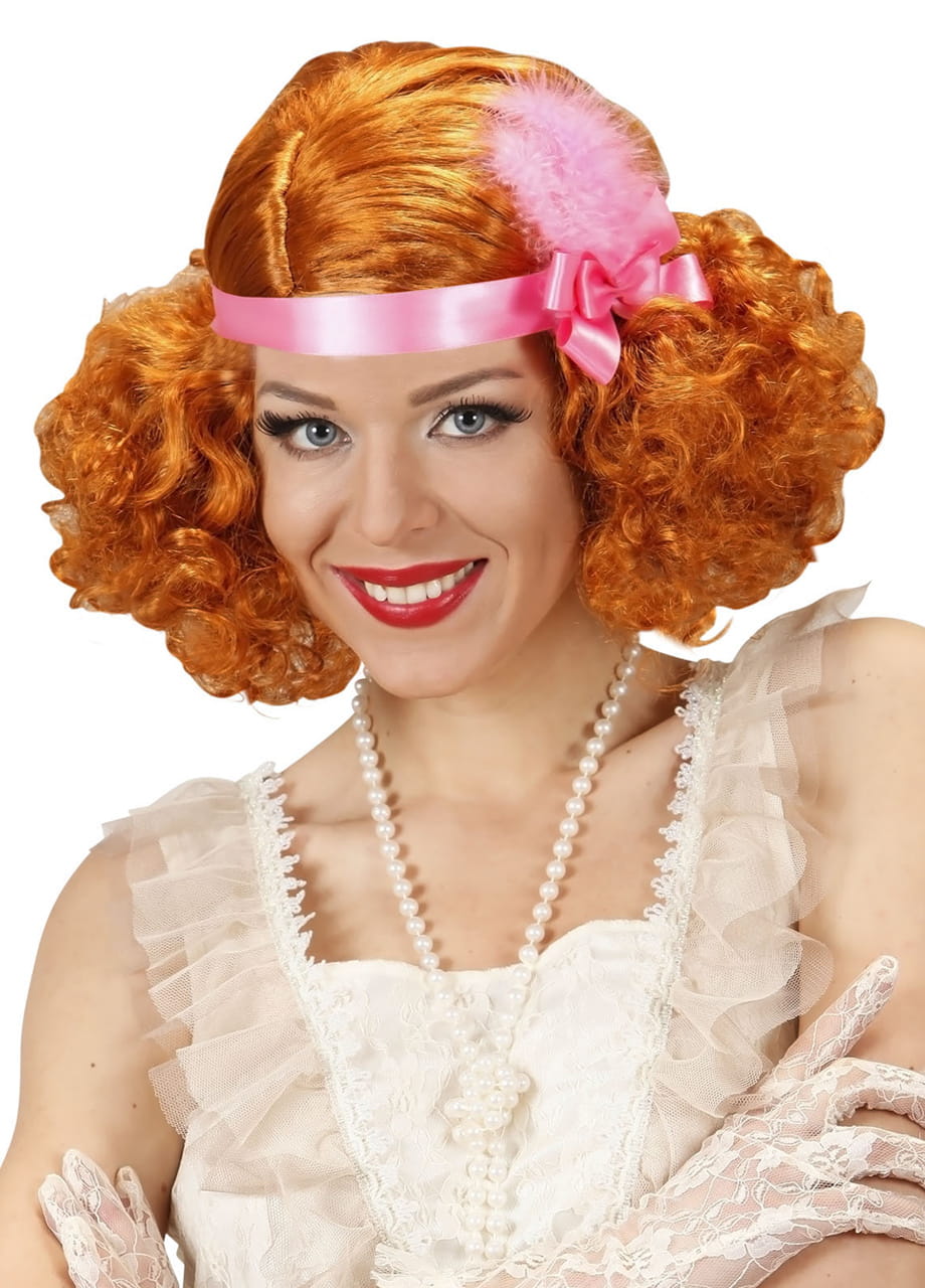 Elegancka, zmysłowa, kusząca. To trzy cechy, które doskonale opisują prezentowaną ozdobę głowy. Piękna, ruda peruka lata 20 to płomienny akcent w kostiumowym zestawieniu. Jeśli lubisz zaskakiwać towarzystwo, a standardy i tradycjonalizm to nie Twoja bajka, to ta peruka z pewnością przypadnie Ci do gustu. Wciel się w damę wyjętą z okładek angielskich żurnali. Wyraziste w barwie, mocno kręcone włosy potrzebują ujarzmienia, dlatego do kompletu dodaliśmy różową opaskę wykończoną kokardą z zalotnym piórkiem. Ruda peruka lata 20 pomoże Ci stworzyć kreację kabaretową.