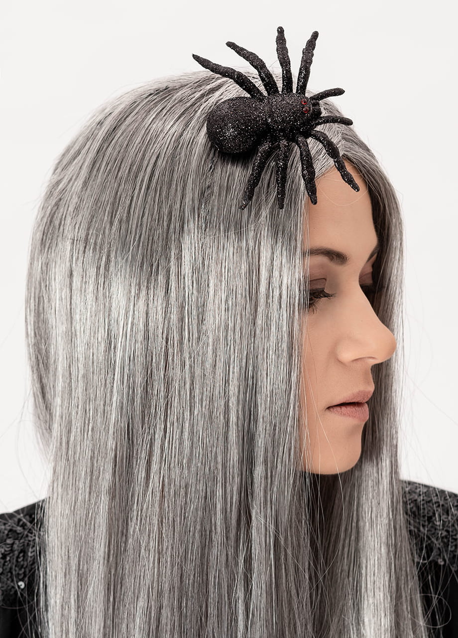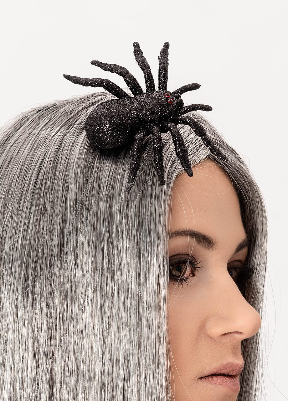 Spinka do włosów z brokatowym, czarnym pająkiem stanowi idealne dopełnienie stroju halloweenowego.