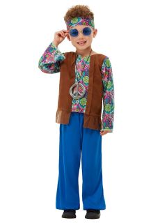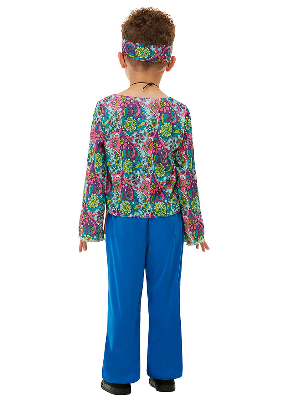 Na głowę chłopca dołączona jest charakterystyczna opaska z kwiatami lub wzorami etnicznymi, stanowiąca nieodłączny element przebrania hipisa. Wygodne, luźne kroje oraz materiały o przyjemnym w dotyku wykończeniu zapewniają komfort noszenia i swobodę ruchów podczas każdej zabawy. Ten strój hipisa dla chłopca to idealna propozycja dla młodego miłośnika historii i kultury, który chce przenieść się w magiczny świat lat 60. Taki kostium dziecięcy nadaje się na karnawał lub na przedstawienie szkolne.