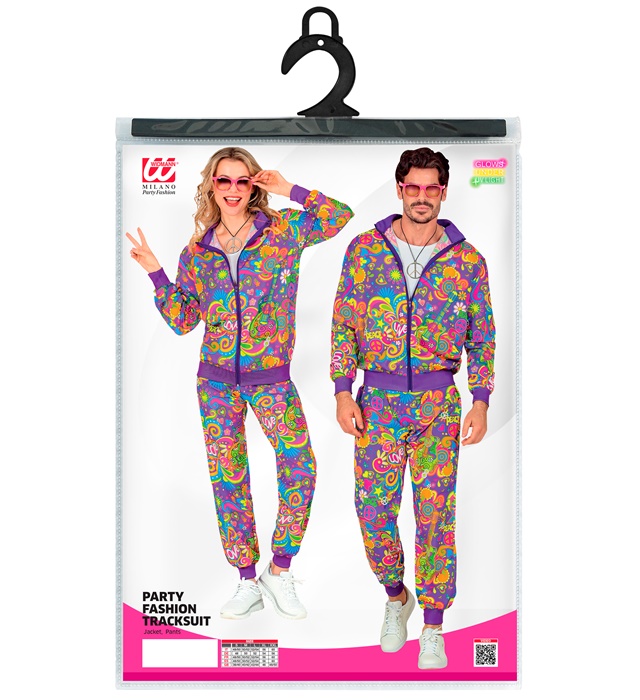 • kolorowy komplet dresowy z unikatowym nadrukiem w stylu lat 70.