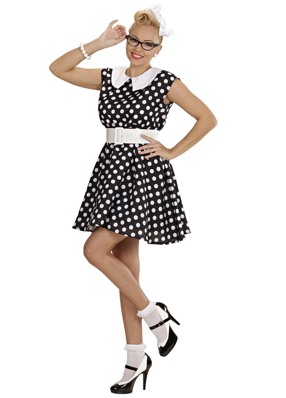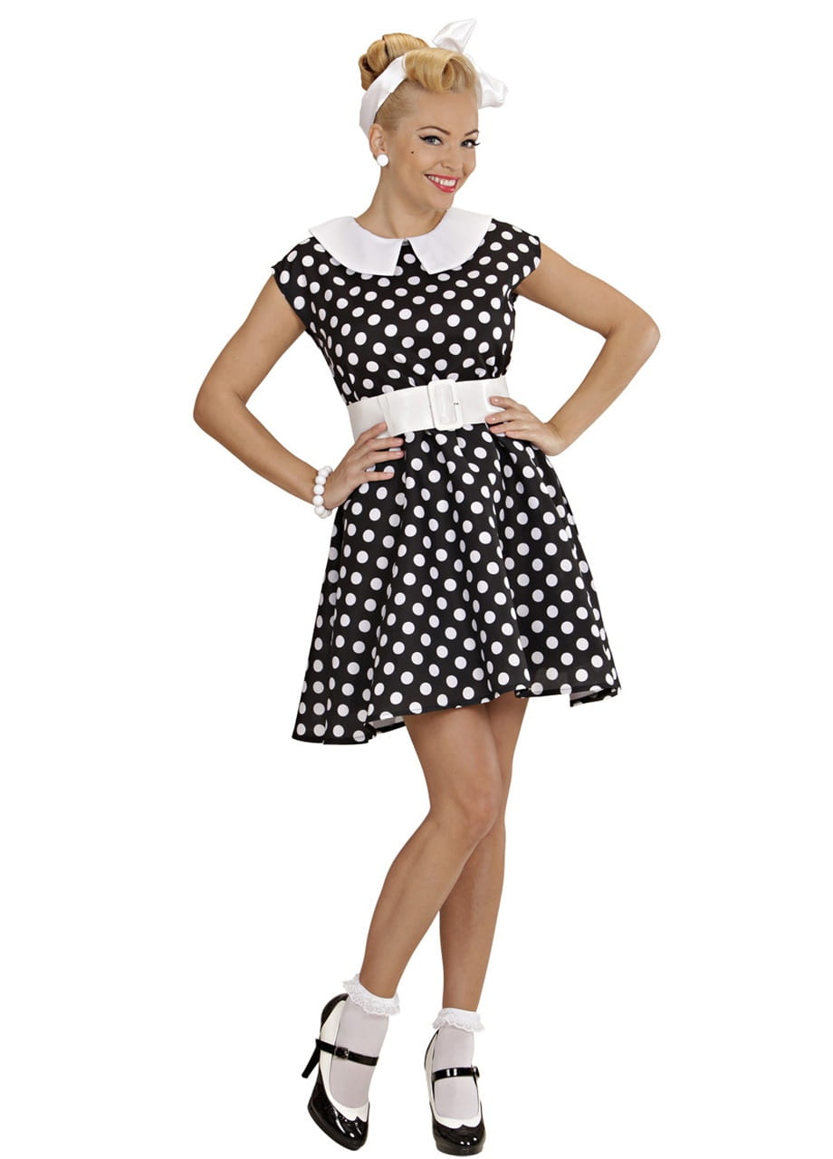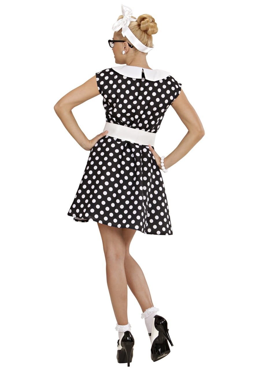Strój LATA 50. Charakterystyczna, czarna sukienka w białe grochy doskonała na szaloną zabawę w rytmie rock and rolla. Idealna na tematyczną imprezę w stylu pin up.