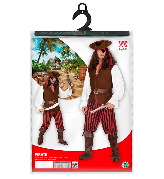 • w komplecie: koszula z kamizelką, spodnie, pasek, nakładki na buty, opaska na głowę, kapelusz, opaska na oko