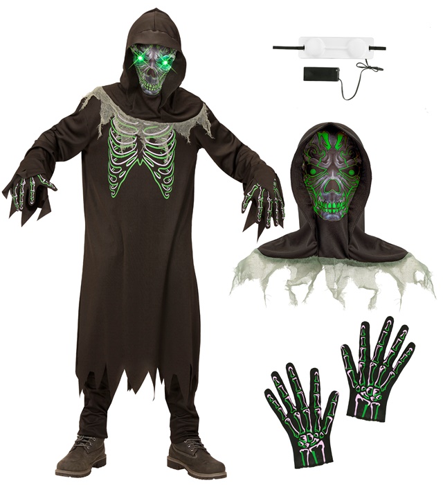 w komplecie: szata, rękawiczki, maska z kapturem i stopniowo rozjaśniającymi się, świecącymi oczami