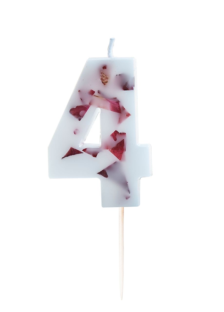 Świeczka cyferka 4. Świeczka urodzinowa z płatkami kwiatów będzie piękną ozdobą tortu na 40 urodziny, lub rocznicę ślubu w stylu boho.