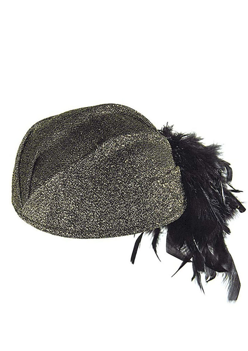 Elegancki, usztywniony toczek w kolorze złotym, ozdobiony piórkiem.