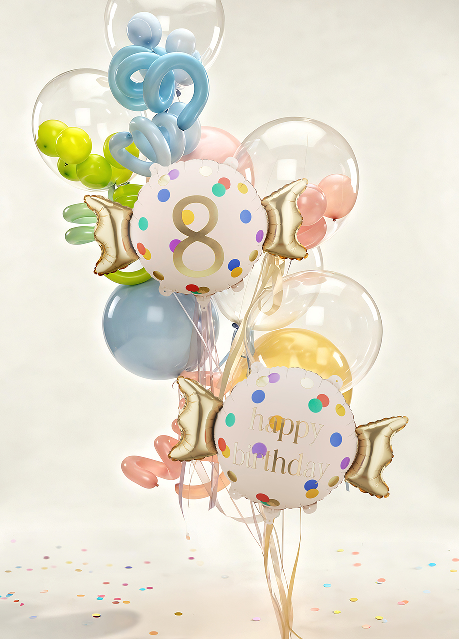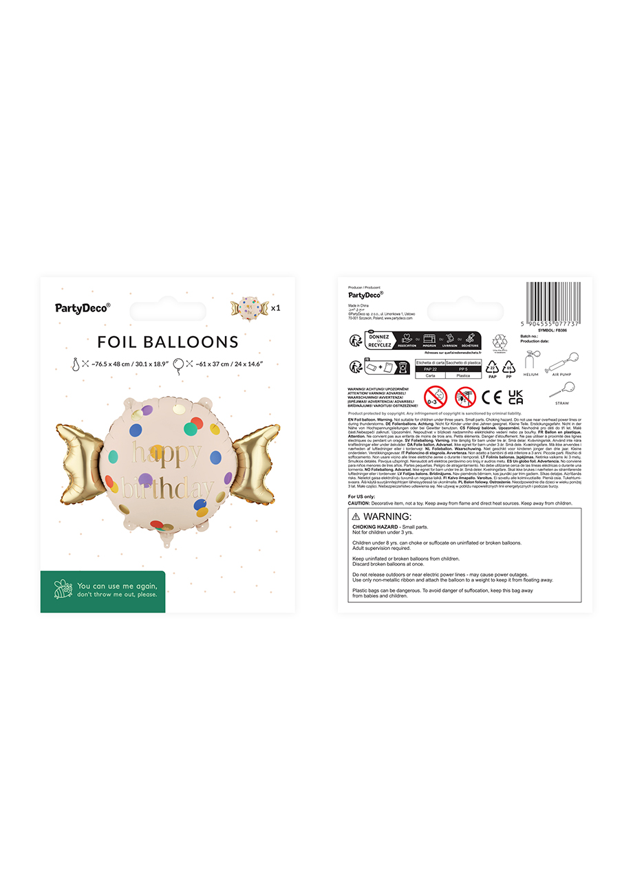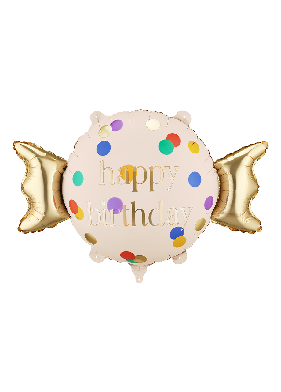 balon foliowy w kształcie cukierka z napisem "happy birthday"