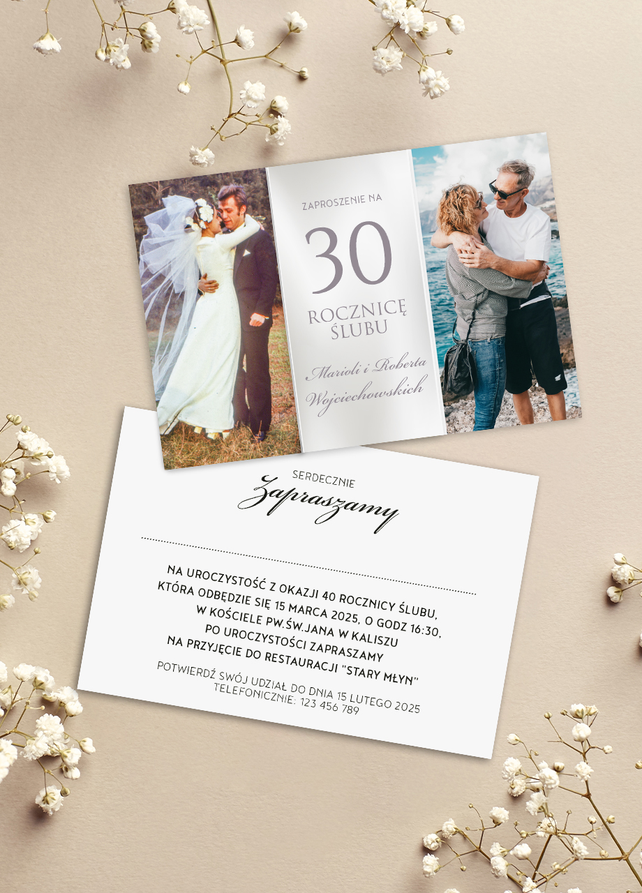 Szukasz wyjątkowego sposobu, aby zaprosić bliskich na 30 rocznicę ślubu? Nasze zaproszenia na 30 rocznicę ślubu ze zdjęciami to idealne rozwiązanie! Dzięki personalizowanym zaproszeniom na rocznicę ślubu możecie uczcić ten ważny dzień w naprawdę wyjątkowy sposób.