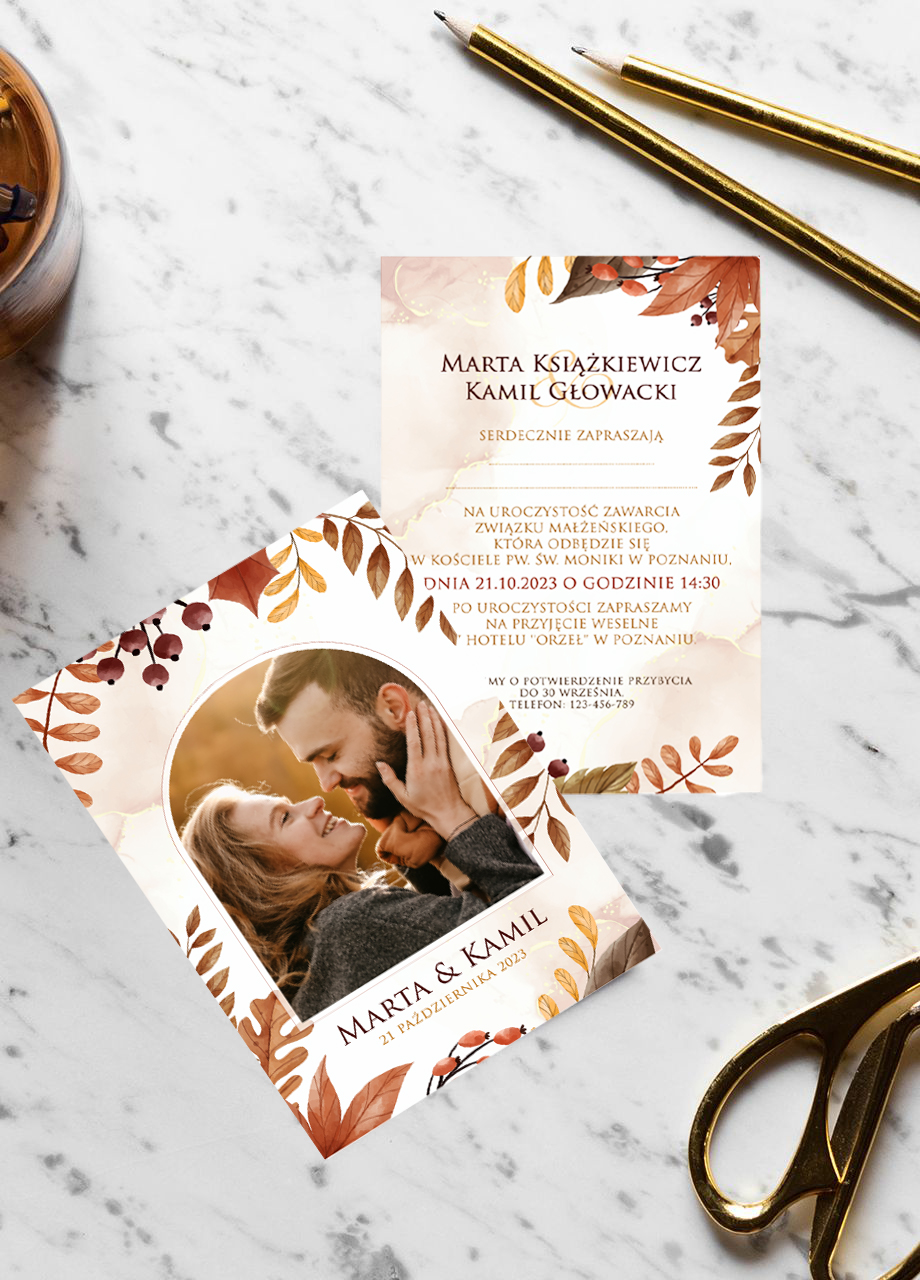 Nasze zaproszenia ślubne JESIENNE to wyjątkowy sposób na zaproszenie swoich bliskich do wspólnego świętowania. Zaproszenia tą wyjątkowe także pod tym względem, że oferują możliwość dodania własnego zdjęcia.