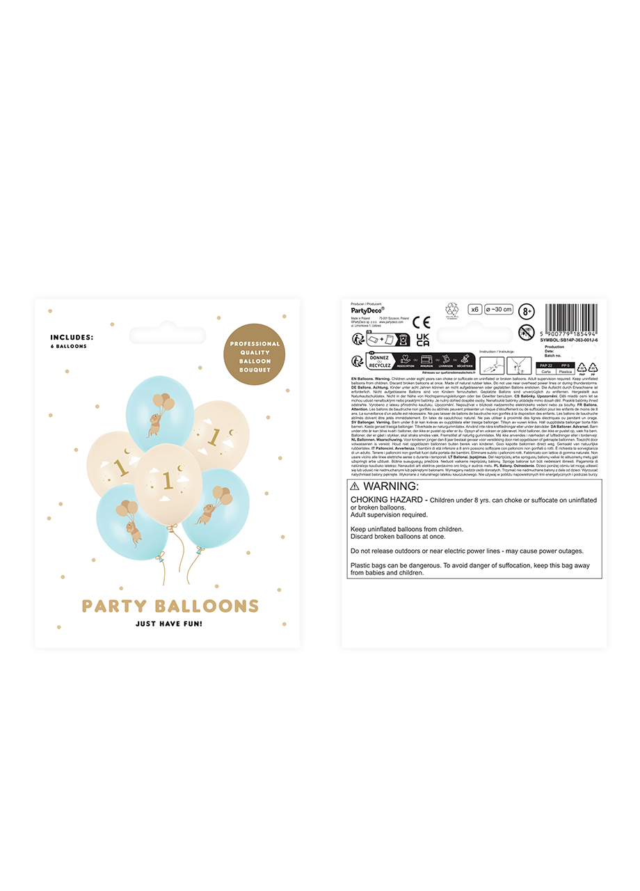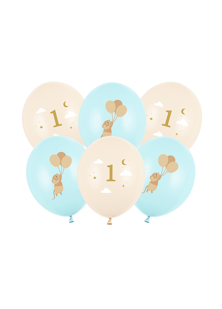 w komplecie: 6 sztuk (3 balony w kolorze pastelowy niebieski z nadrukiem; 3 balony w kolorze pastelowy róż z nadrukiem)