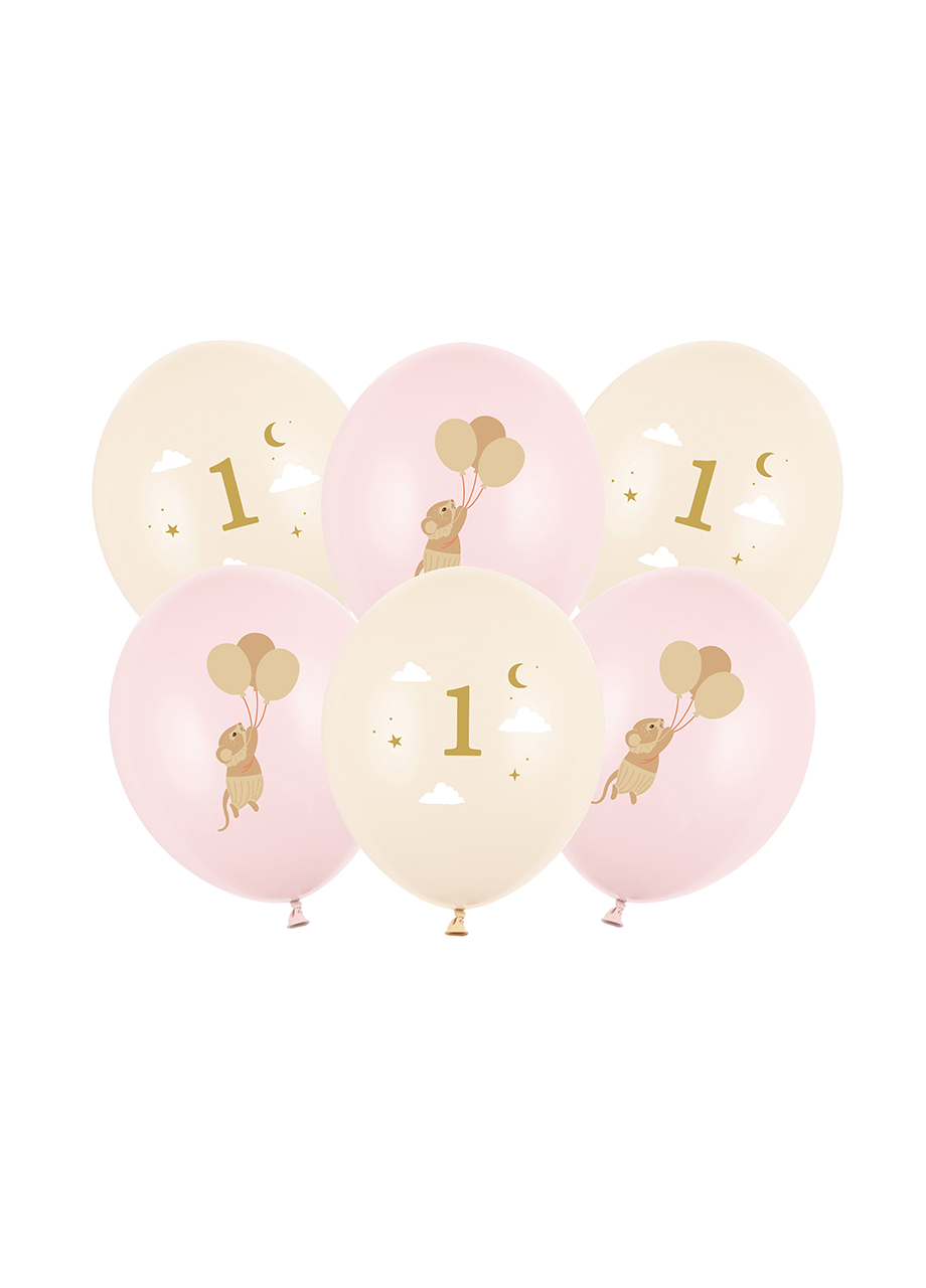 w komplecie: 6 sztuk (3 balony w kolorze bladoróżowym z nadrukiem; 3 balony w kolorze pastelowy róż z nadrukiem)