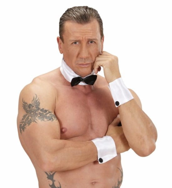 opaska na szyję z przyklejoną muszką, zapinana z tyłu na rzep, mankiety zapinane na rzep